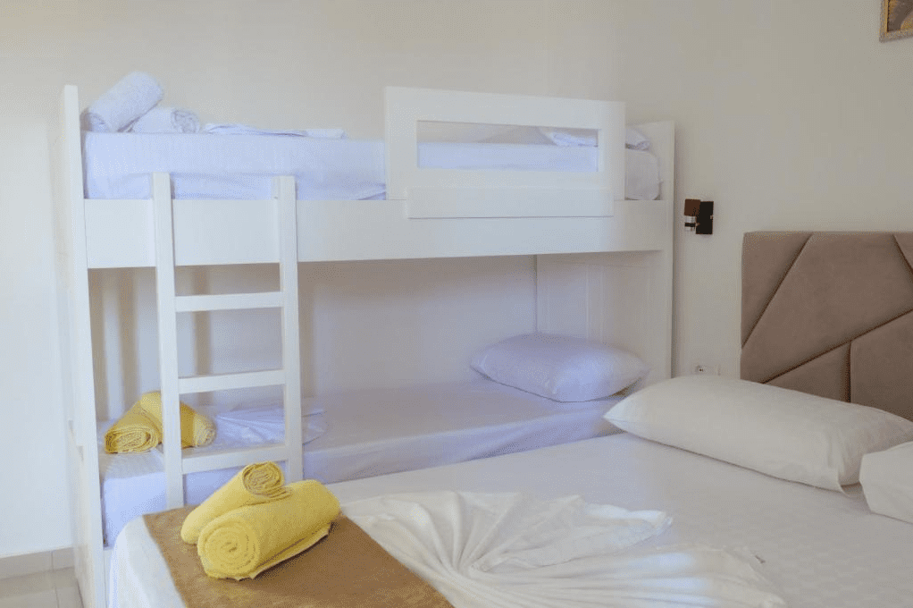 These spacious rooms come with single or double beds making them ideal for family stays or groups of friends traveling together.This room offer a modern decor with neutral whites on the walls and lively splashes of colors that brighten up the atmosphere.Quadruple Room measures 40m2 and includes a double bed and two single beds while the bathroom is equipped with modern white tiles .